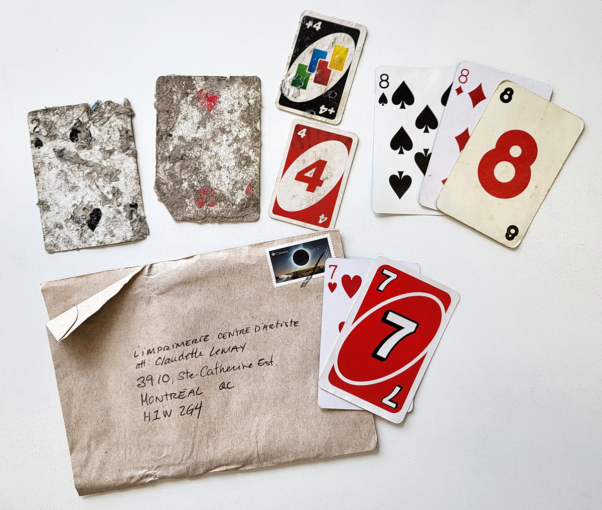 Après avoir partagé une photo numérique de sa collection de cartes, qui comprend au moins 4 jeux complets, l’artiste Mélissa Longpré m’envoie quelques doublons par la poste. C’est tellement rare qu’on reçoit du courrier de nos jours! Merci à cette grande collectionneuse!