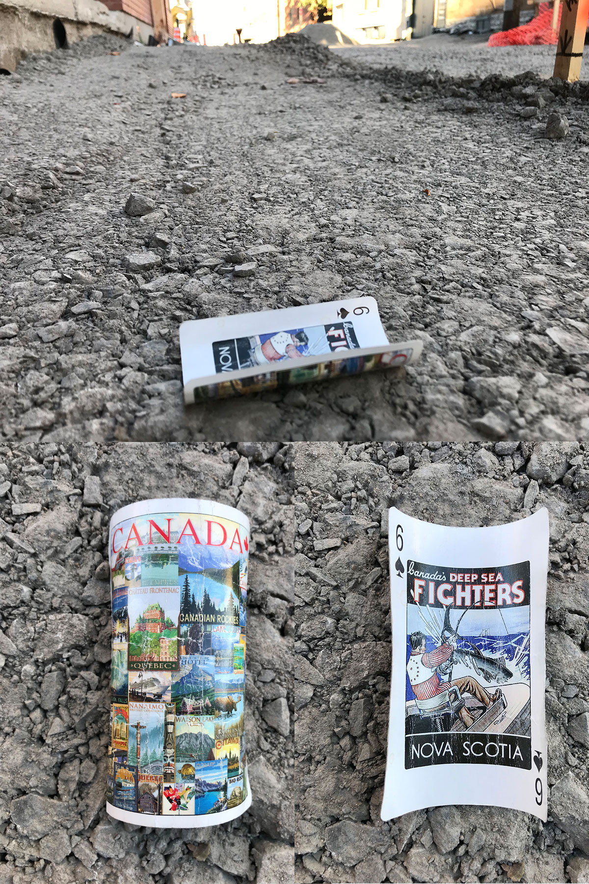 « En sortant de chez moi pour aller courir sur les plaines d’Abraham, à Québec, en remontant du côté ouest, je suis tombé par hasard sur une carte à jouer : un six de pique, Canada’s Deep Sea, Fichters, Nova Scotia, Canada, avec la feuille d’érable rouge d’un côté, entourée d’images des provinces, et, de l’autre, un fond plus sombre orné du six et de l’as de pique. Je ne me souviens plus de quel côté je l’ai vue en premier — la face illustrée du Canada ou celle du six de pique. C’était en tout cas sur la rue Saint-Olivier, entre les rues Sutherland et Philippe-Dorval, le samedi 4 octobre, vers 15 h 45. J’ai aussitôt pensé au projet de Claudette Lemay. Je l’ai donc mise de côté après avoir ouvert et refermé ma porte, avec l’intention de la photographier à mon retour, après ma douche. Les photos ont été prises avec un iPhone 7 (nom : Yannick-TEL, version du logiciel 15.8.5), dont la batterie nécessite une réparation. J’ai capté huit clichés vers 16 h 51, sur une portion de rue défoncée et parsemée de roches, la voie étant en travaux pour réaménagement. J’ai croisé un voisin d’en face que je ne connais pas, occupé à réparer le bas de son immeuble, ainsi qu’une passante que j’ai à peine regardée, préférant ne pas attirer l’attention ni paraître suspect. Je suis ensuite rentré quelques minutes plus tard pour rédiger ce texte, terminé vers 17 h, sur mon MacBook Pro 14 pouces (2021), équipé d’une puce Apple M1 Pro et de 32 Go de mémoire. J’ai alors sélectionné les huit photographies, que j’ai transférées via AirDrop sur Yannick-Mac ; après l’attente et l’acceptation, je les ai enregistrées dans mon dossier Téléchargements, avant de les supprimer de mon téléphone vers 17 h 10. Les images, initialement au format .HEIC, ont été converties en .JPG grâce à HEIC Converter, en conservant leurs noms originaux — IMG_5709.jpg à IMG_5716.jpg (l’image IMG_5710.jpg sera finalement supprimée) — avant d’être immédiatement envoyées à la destinataire, vers 17 h 36. »
