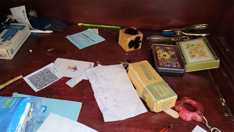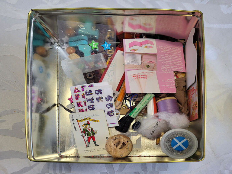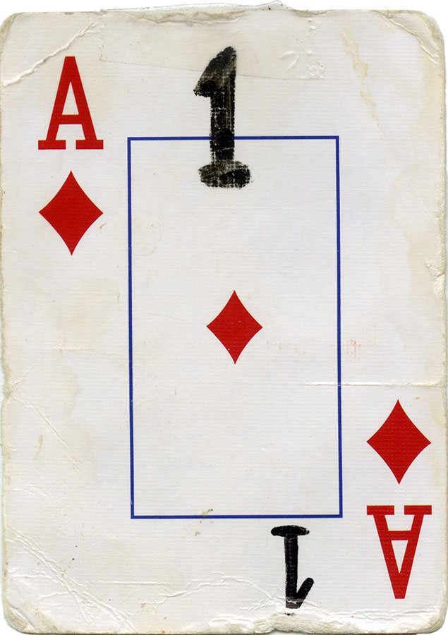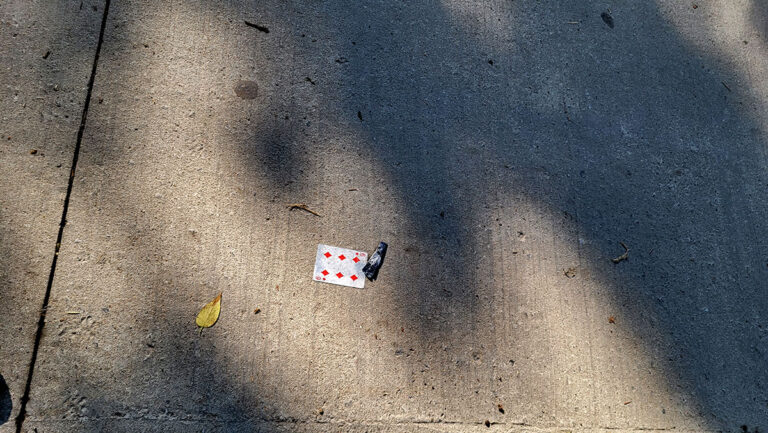 Depuis près de 30 ans, je collectionne des cartes trouvées au hasard. J’en ai récolté plus d’une centaine à ce jour. Je m’intéresse à leurs motifs, aux textures, aux traces laissées par les intempéries, à leur symbolique parfois, et aussi au lieu où je les trouve. Je relève des coïncidences, fais des associations, cherche parfois du sens. Cette collection questionne le rôle du hasard dans nos vies avec un aspect ludique. Elle s’inscrit sur une ligne de temps qui réfère au journal intime et au quotidien.