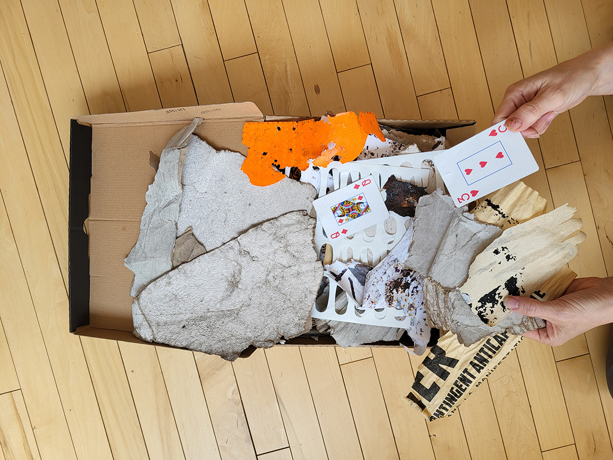 A.D. collecte des rebuts de papier dans la rue. Matières dégradées, textures étranges, couleurs surprenantes. Dans sa boîte de trésors, il y avait deux cartes. La chance pour moi!